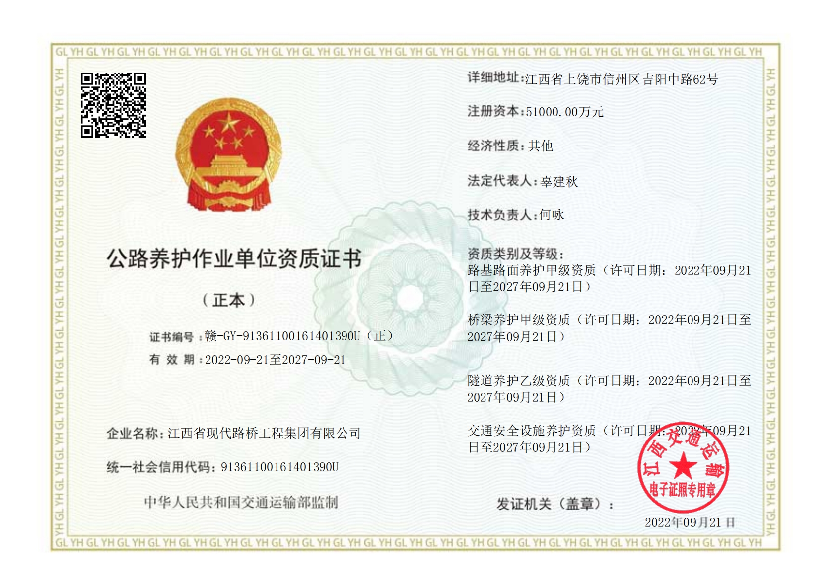 公路養護作業單位資質證書